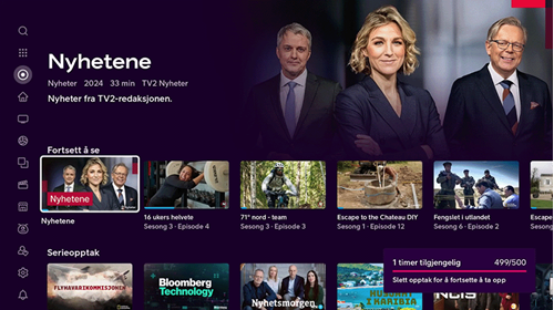 Du kan velge mellom å ta opp enkelt-episoder, hele sesonger av et program eller hele serier. Opptakene legges under Mitt Innhold i menyen. Dette når du enkelt ved å trykke fjernkontroll-knappen med samme navn.